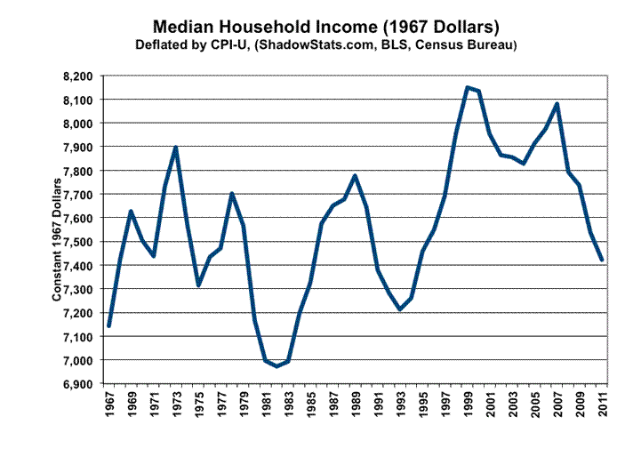 von oben Paul Craig Roberts Heute erleben die Menschen des Westens die Zerstörung ihres Wohlergehens, die vergleichbar ist mit dem, was das eine Prozent in Rom mit den römischen Bürgern und eroberten Völkern aufzwang. Hier beschreibt John Williams (shadowstats.com 12.9.2012) die Auslöschung der Hoffnungen der Amerikaner: Die Konsumenten kommen einfach nicht mehr zurecht. Das inflationsbereinigte oder reale durchschnittliche Haushaltseinkommen sinkt bereits seit vier Jahren und befindet sich auf den tiefsten Stand seit 1995. Gebremst durch den Verbraucherpreisindex rangieren die Werte des Jahres 2011 in der Tat unter den niedrigen Werten der späten 1960er und frühen 1970er Jahre. Ungeachtet der anhaltenden Natur der wirtschaftlichen und systembedingten Bonitätskrisen und der Auswirkungen der Finanzpanik des Jahres 2008 hat die Einkommensverteilung die Bewegung der Einkommen weg von der Mitte in Richtung der Extreme nach oben wie nach unten zur gleichen Zeit eine Rekordhöhe erreicht, anstatt sich zu mäßigen, wie in Perioden finanzieller Probleme erwartet werden könnte. Extreme in der Einkommensverteilung lassen üblicherweise größere Katastrophen im Finanzmarkt und in der Wirtschaft vorausahnen. Mit der derzeitigen Lage auf einem Rekordhoch und sehr wohl über den Werten liegen, die schätzungsweise vor dem Börsenkrach 1929 und der Großen Depression erreicht wurden, sind für die kommenden Jahre zunehmend schwierige Zeiten zu erwarten. Diese Tabelle zeigt, wo der Mittelwert des Haushaltseinkommens der Supermacht Vereinigte Staaten von Amerika, des unentbehrlichen Volkes am Höhepunkt 2011 steht. Den Amerikanern geht es genauso gut wie 1967/68. Die meisten Amerikaner können nicht für die Multibillionen Dollar teuren Kriege seit elf Jahren und Billionen von Dollars für die Deckung der Spielschulden von Wall Street bezahlen, ihre Mittelschichtjobs von den Konzernen ins Ausland verlagern lassen und noch immer darauf hoffen, höhere persönliche Einkommen zu erzielen.