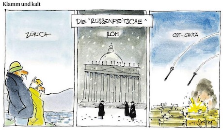 Man könnte darüber lachen. Wie man über die Kinderzeiten lacht, als der Welterklärung genüge getan war, wenn die Schotten knauserig, die Italiener faul und die Franzosen gegen Seife resistent waren. Aber wenn man die Karikatur auf der Cover-Seite des Zürcher «Tagesanzeigers» vom 27. Februar sieht, bleibt einem das Lachen im Halse stecken. «Die Russenpeitsche» heisst es da, und man sieht Zürich im Frost, Rom im Schnee und Raketen, die auf Ost-Ghuta fliegen.