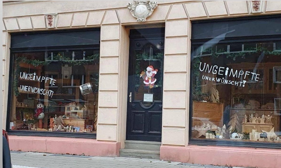 Du fragst dich, was auf dem Schaufenster auf Deutsch steht, nicht wahr? Da steht: "UNGEIMPFTE UNERWÜNSCHT!" Das ist eine bekannte Botschaft hier in Deutschland. Einige von Ihnen kennen sie vielleicht noch aus den 1930er Jahren, obwohl sie sich damals auf eine andere Gruppe von Menschen bezog ...
