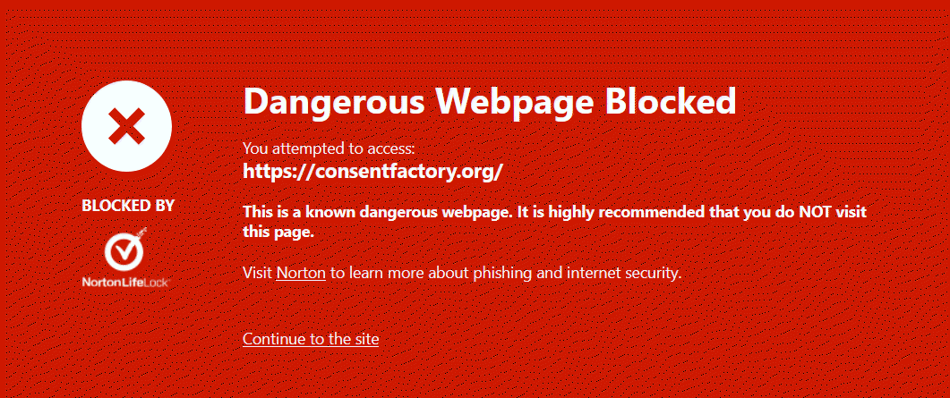 Ich hatte gestern eine kleine Meinungsverschiedenheit mit Jillian C. York, der Direktorin für internationale Meinungsfreiheit der Electronic Frontier Foundation in Berlin, und einigen ihrer vielen hackerähnlichen Twitter-Follower, und heute ... nun, es scheint, dass NortonLifeLock den Blog Consent Factory blockiert und mit einem großen, roten Warnhinweis "gefährliche Webseite" versehen hat. (Sie sehen das vielleicht nicht, wo immer Sie leben, und Sie werden es sicher nicht sehen, wenn Sie Norton nicht benutzen, aber viele Leute benutzen Norton, und das ist ein Problem für einen Autor wie mich).
